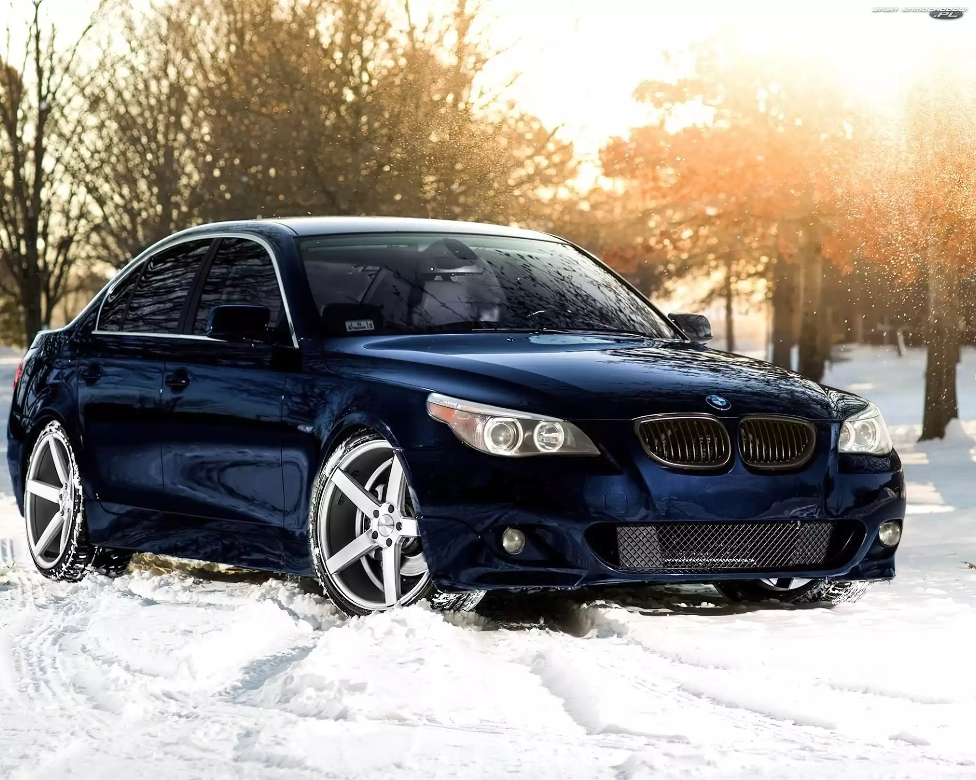 Samochód: BMW, Granatowy, Drzewa, Śnieg, Samochód, M5