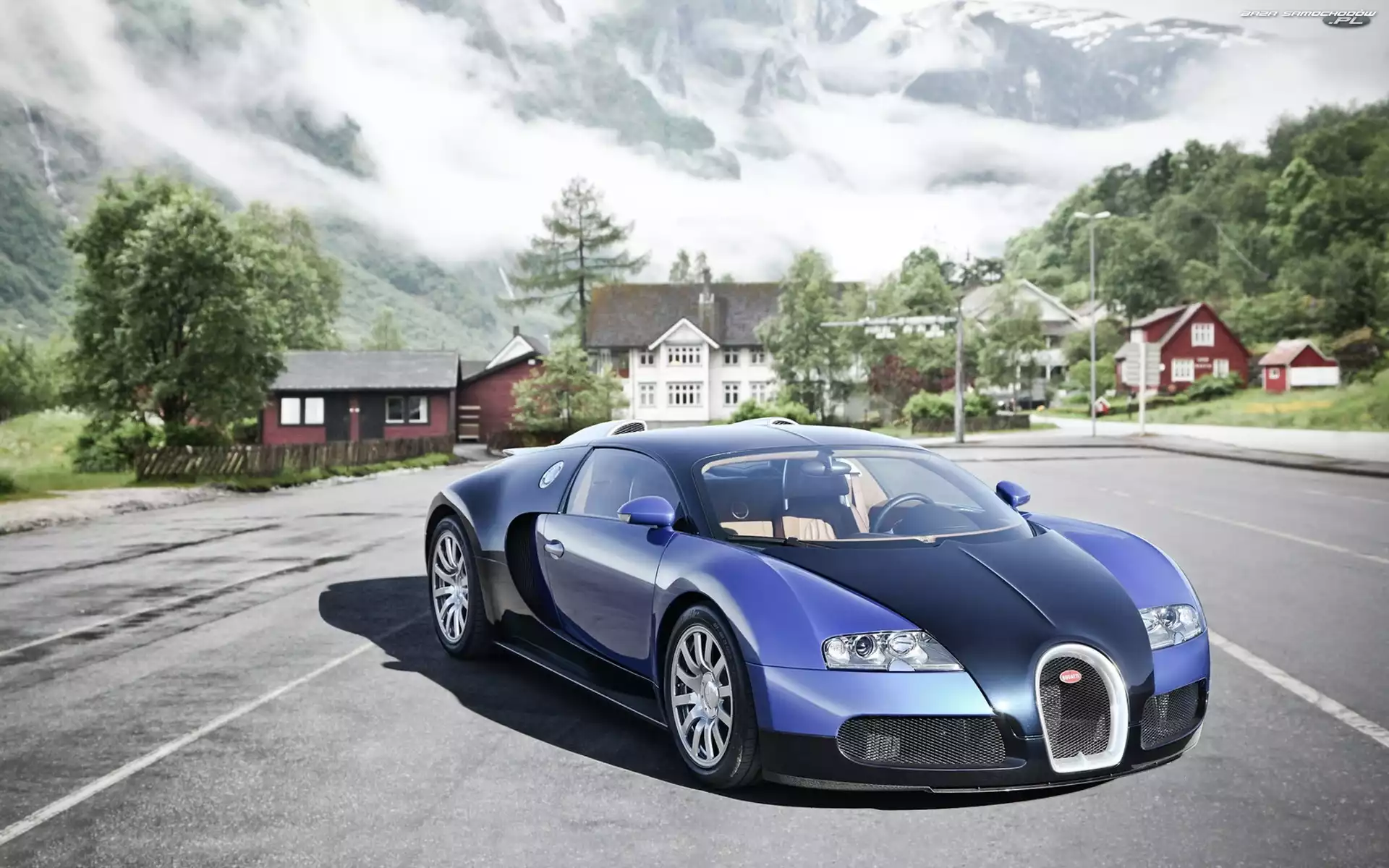 Samochód: Domy, Ulica, Bugatti, Niebieskie, Veyron