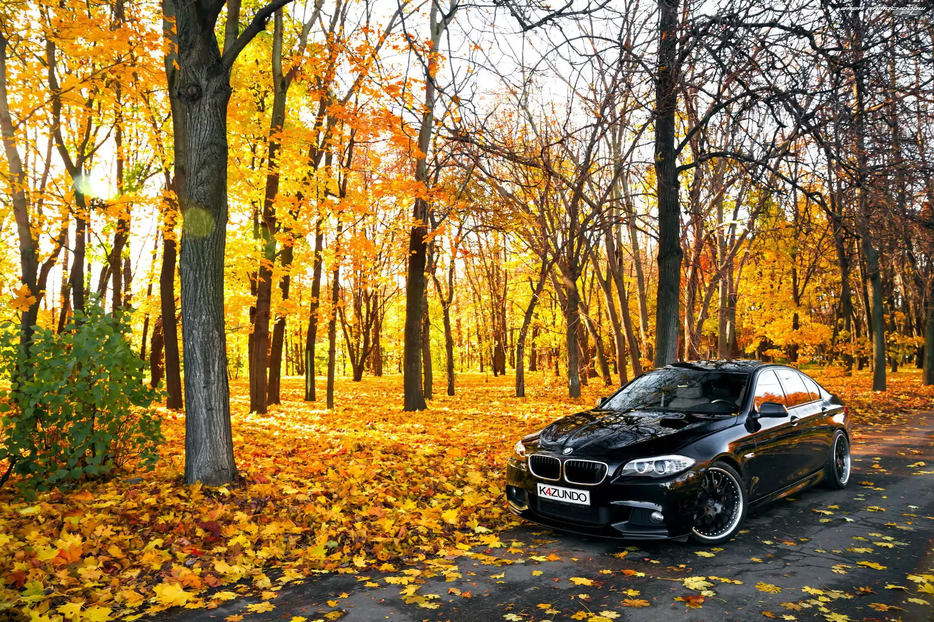Samochód: Drzewa, Jesień, Droga, BMW seria 5 F10, Park
