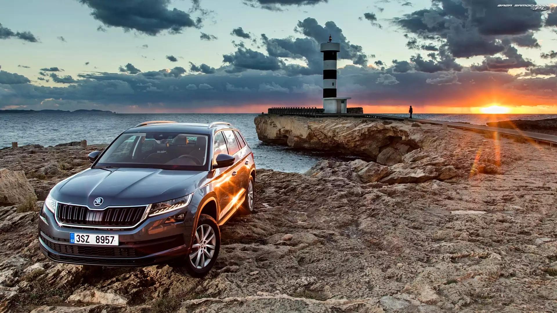 Zachód słońca, Morska, Morze, Skoda Kodiaq, Latarnia- Zdjęcia samochodów